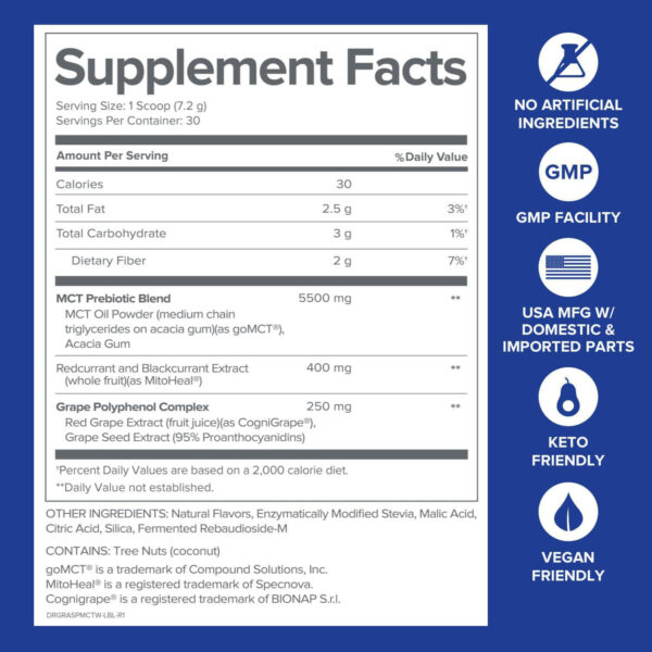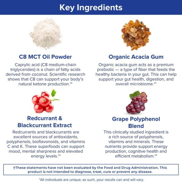 A scientifically formulated blend featuring ​​C8 MCT oil powder​​ (derived from coconut) and ​​plant-based polyphenols​​ to support natural ketone production and cognitive function. Designed to help maintain energy levels and metabolic efficiency without artificial additives.